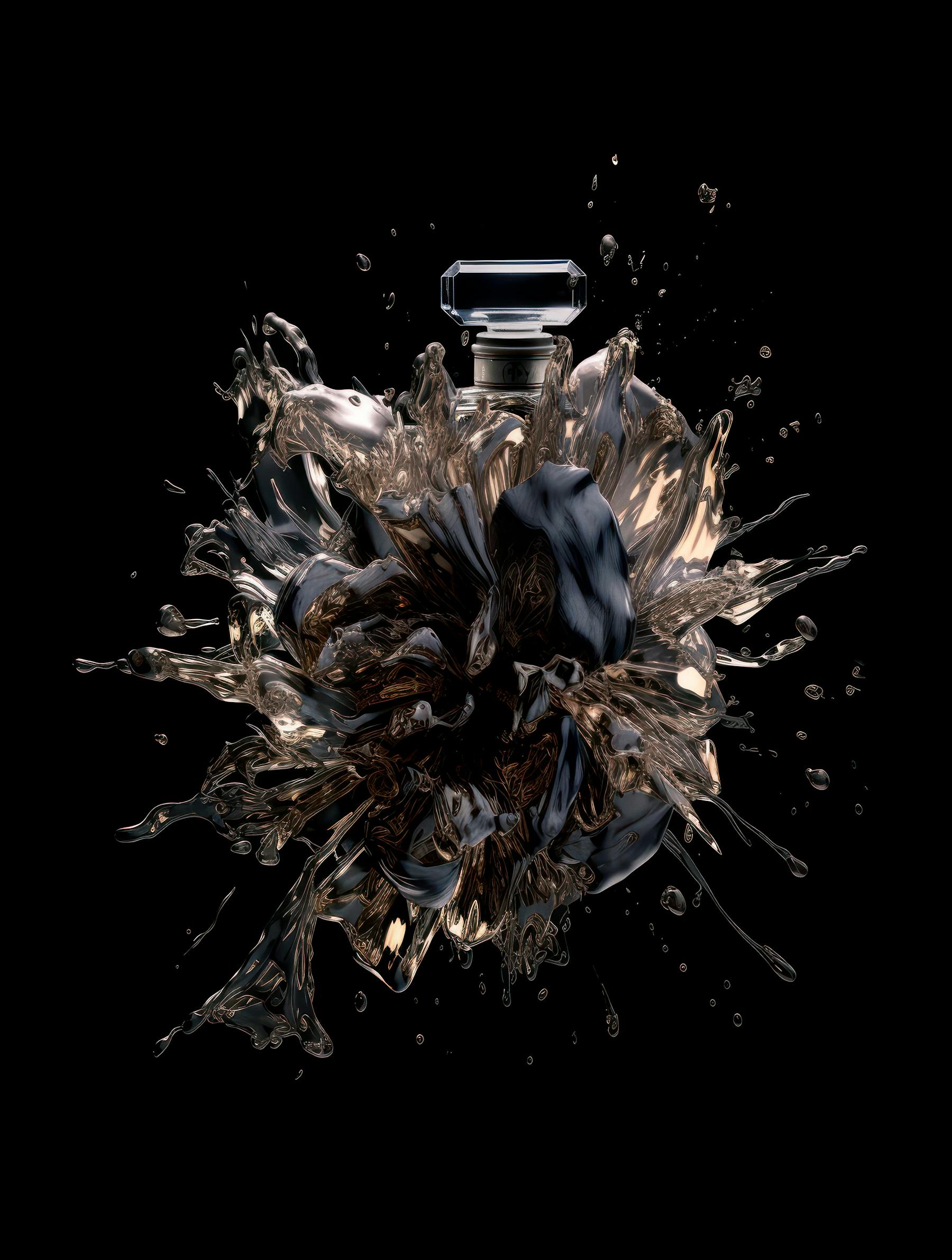 Black flowers, Chanel number five perfume bottle, broken glass, backlight, black flowers, black background, deconstructed, fractal, realistic, abstract photograph, explosion, frontal shot abstract explosion, black flowers