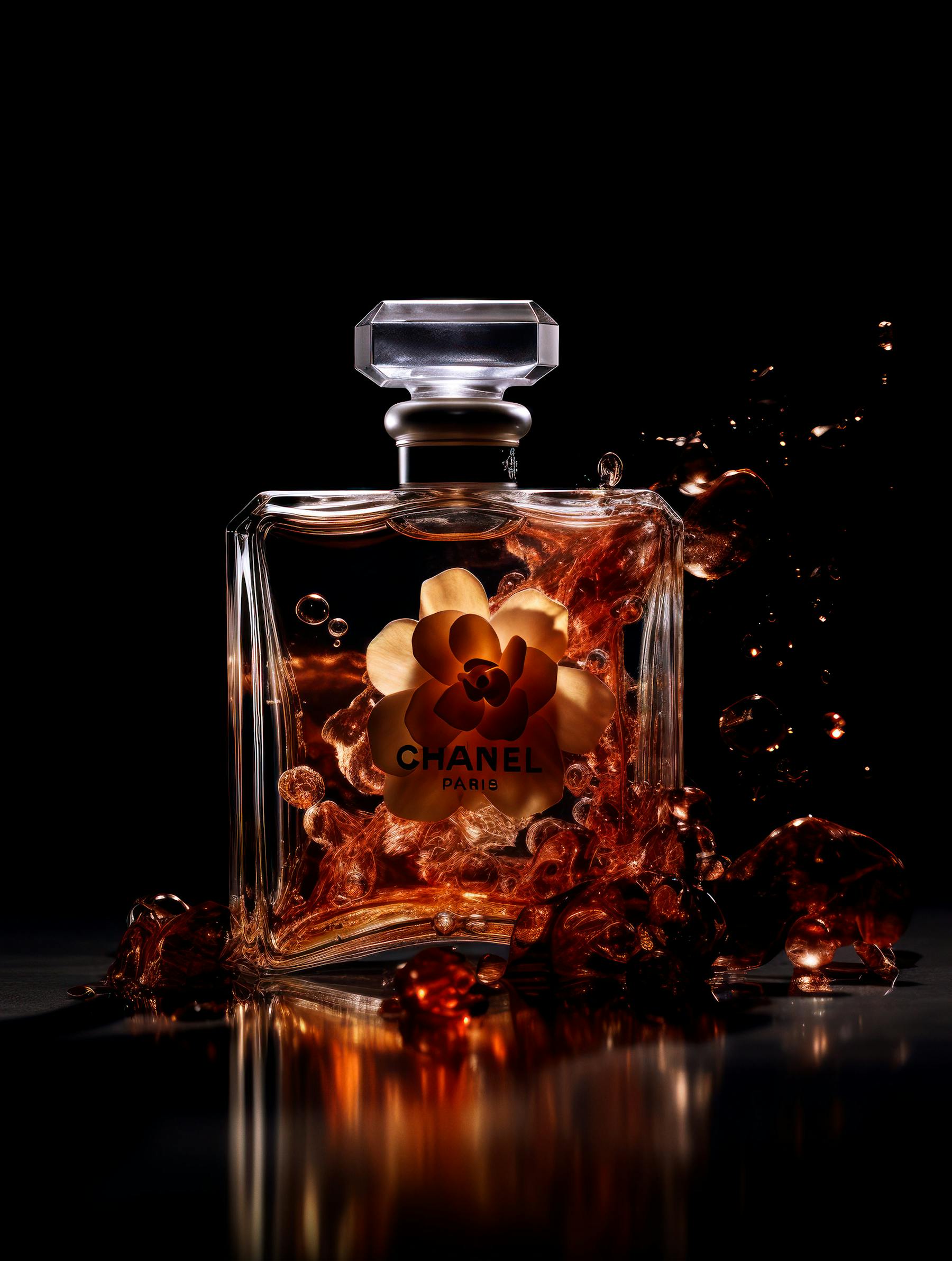 Use this image and incorporate a Chanel number five perfume bottle