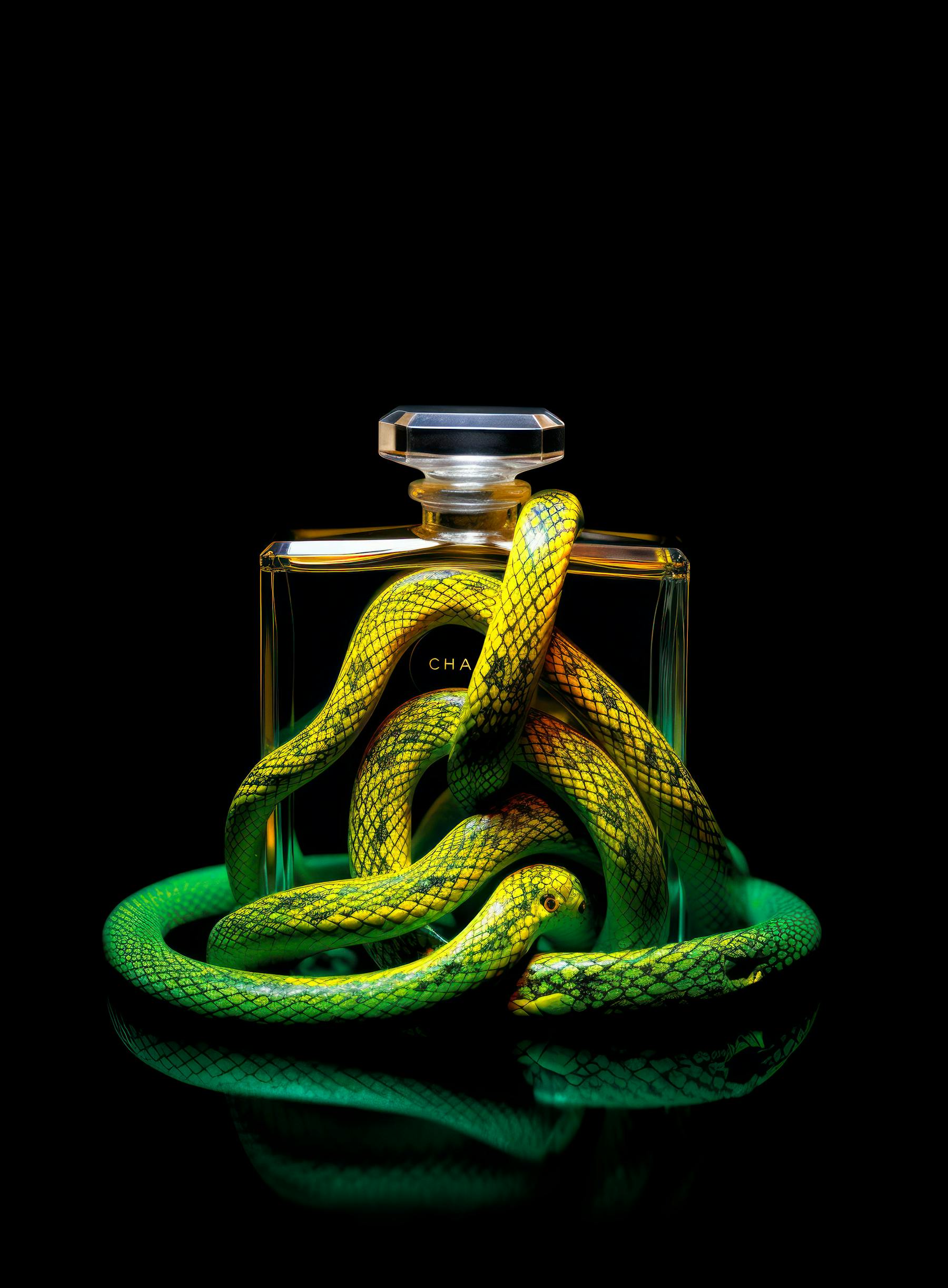 A photograph of a Chanel NO.5 perfume bottle with the serpens in the background referenced here, studio light, caustic lighting, refractions, high contrast, glass, transparency, liquid inside the bottle, diffraction, black