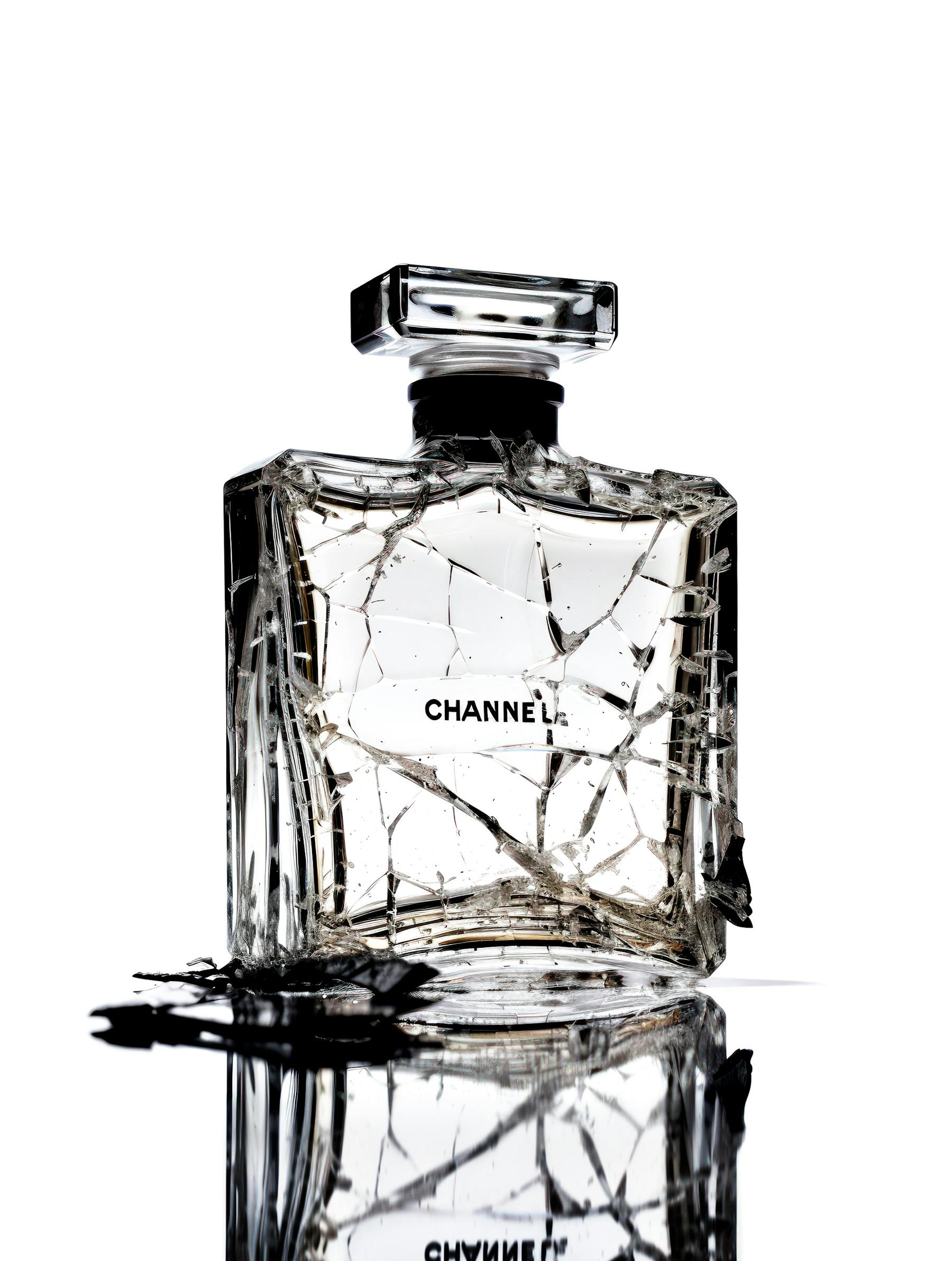Broken mirror inside a Chanel number five perfume bottle, realistic photograph, frontal shot, white background, abstract
