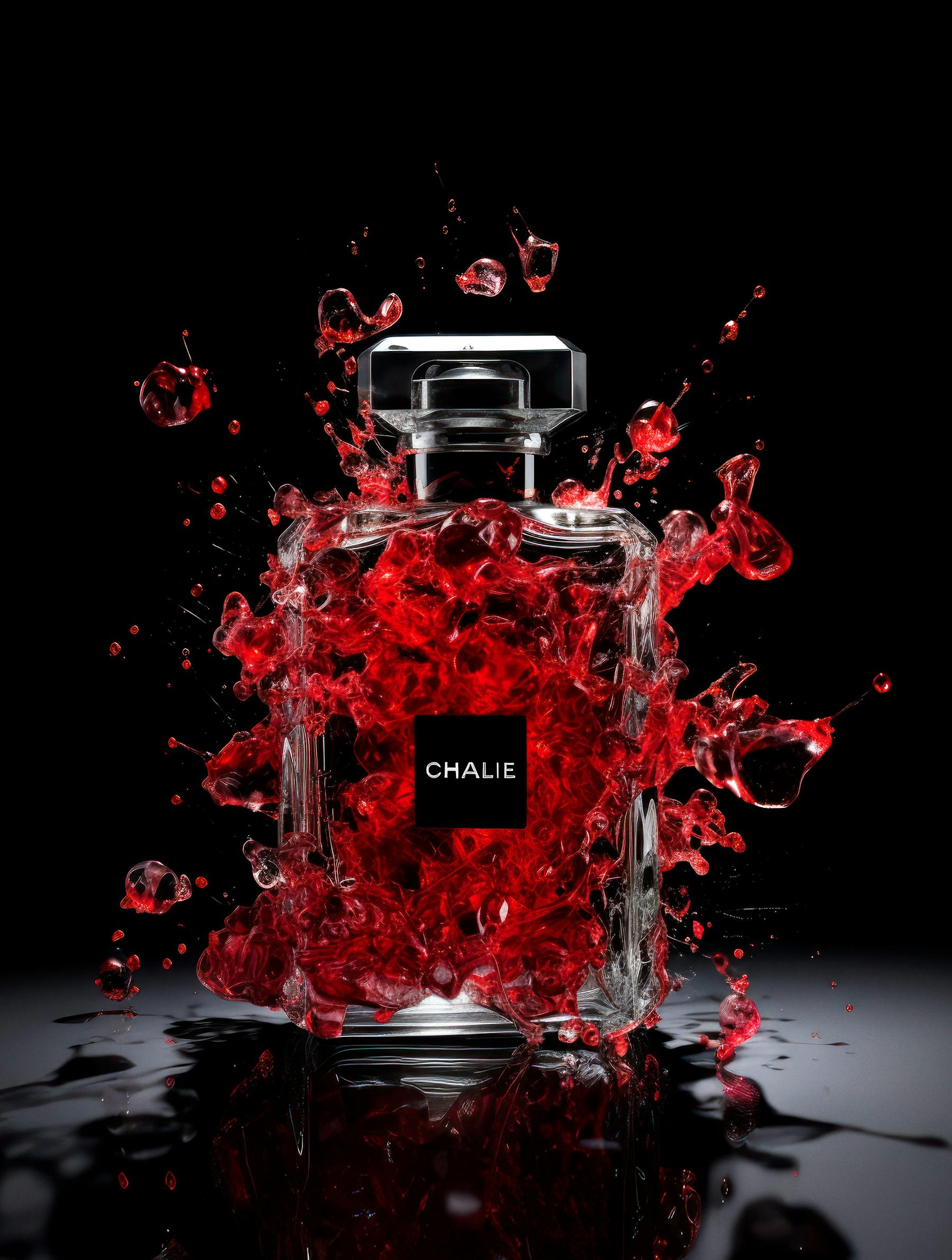 Black flowers, Chanel number five perfume bottle, black, broken glass, backlight, black flowers black background, deconstructed, fractal, realistic, abstract photograph, explosion, frontal shot abstract explosion, red flowers