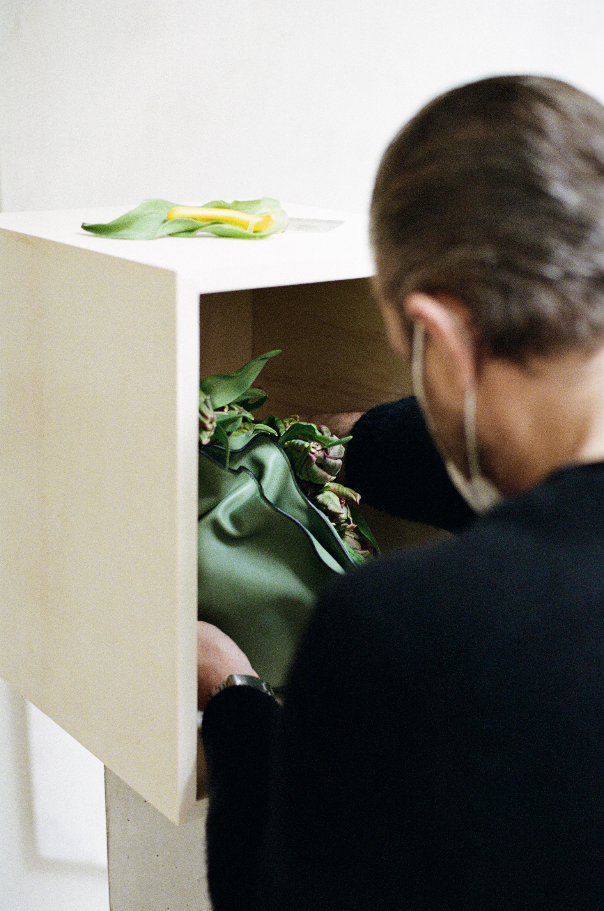 Castor Fleuriste chose parrot tulips to create a fusion of green. The softness of calfskin blends with the fragility of the petals. A green light is then projected on the natural wood sides of the box. As if the bag was illuminating its own habitat.
