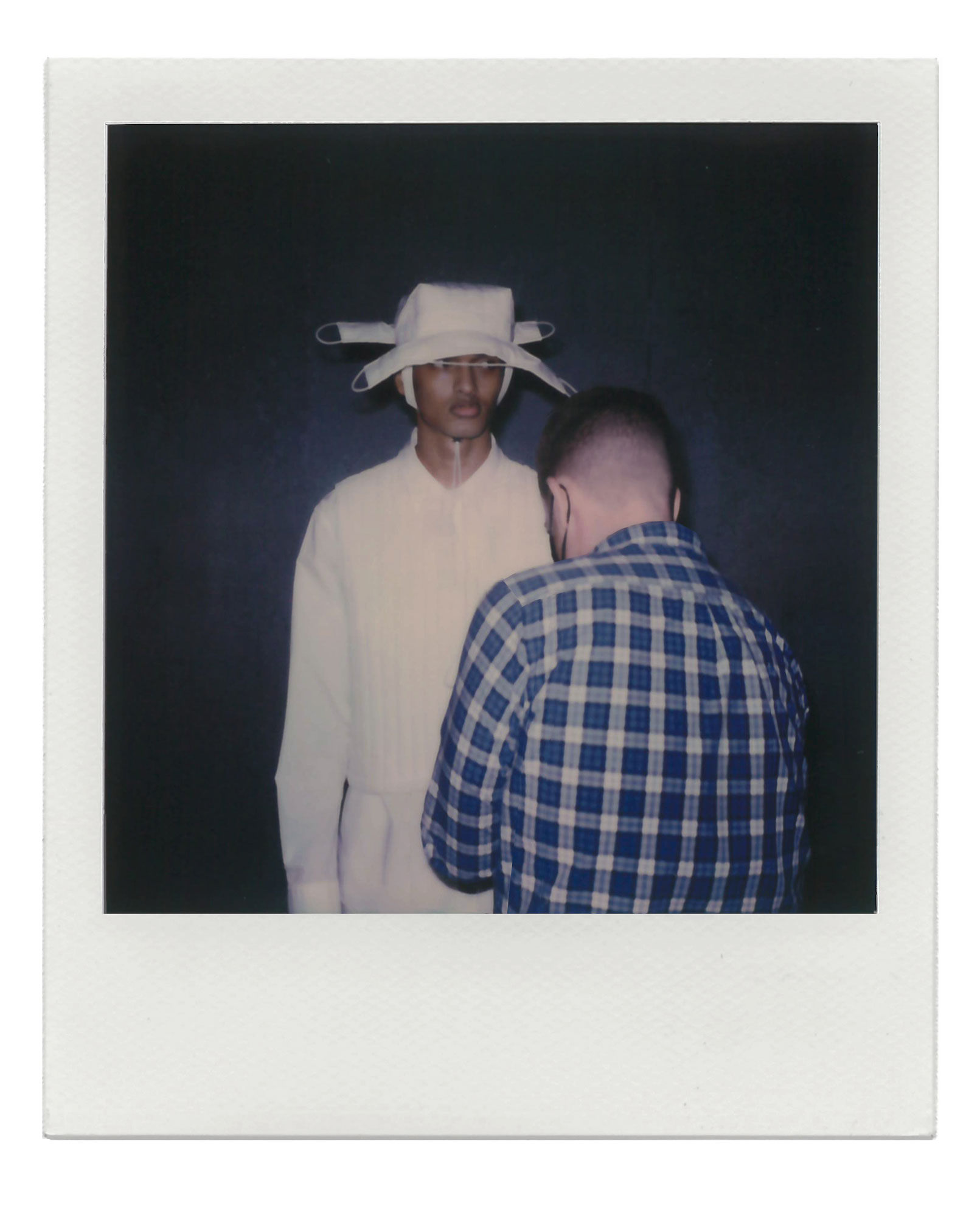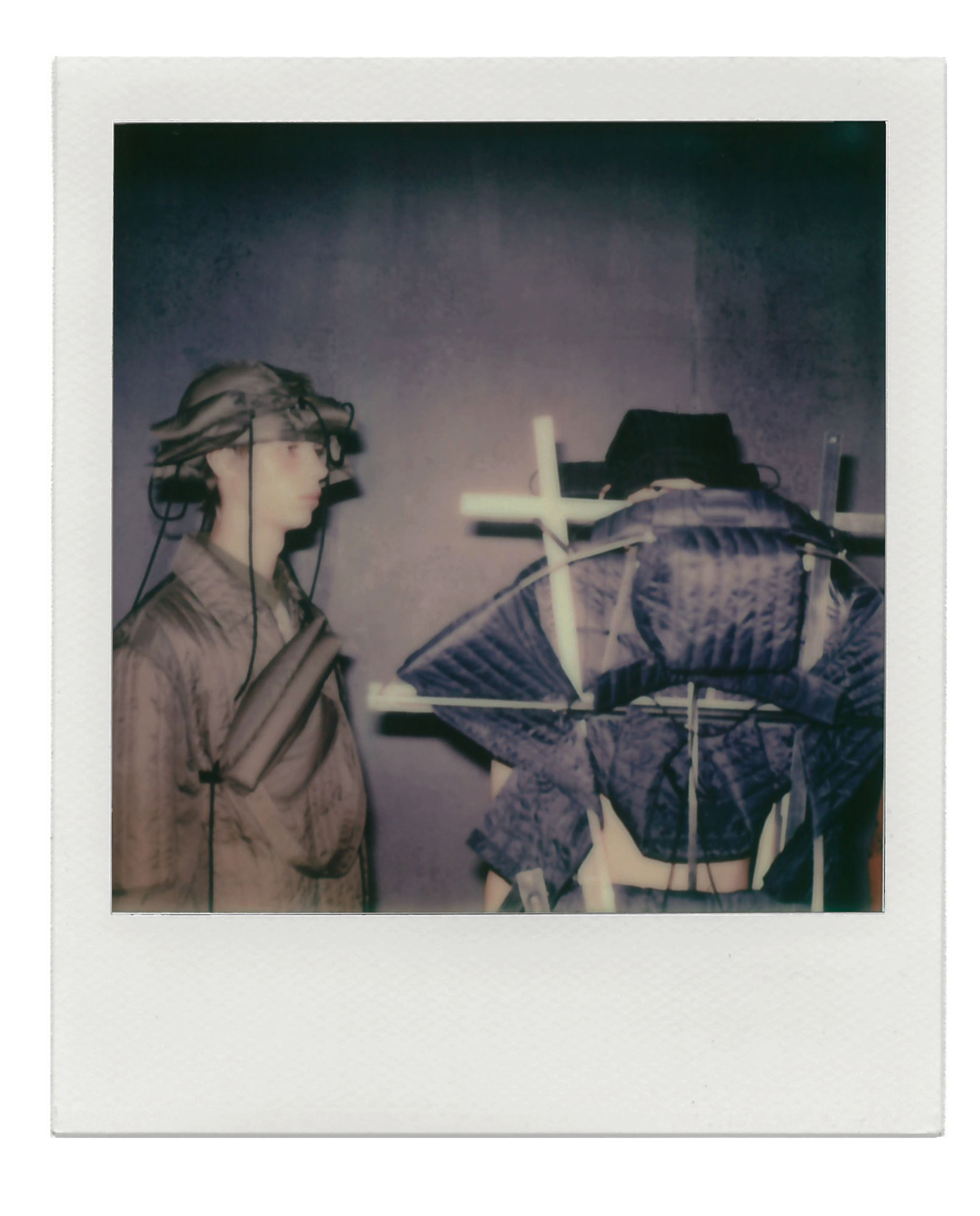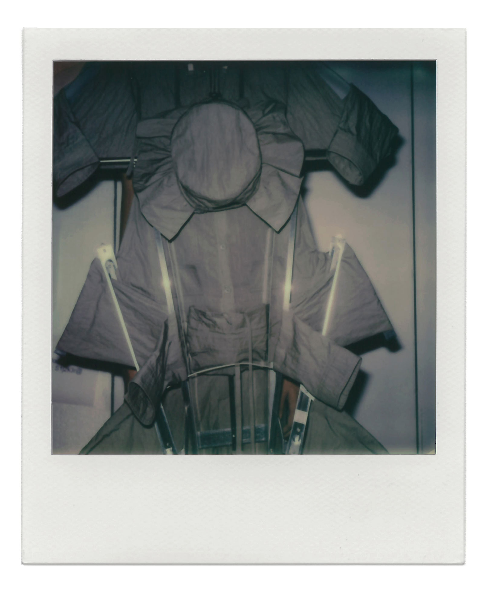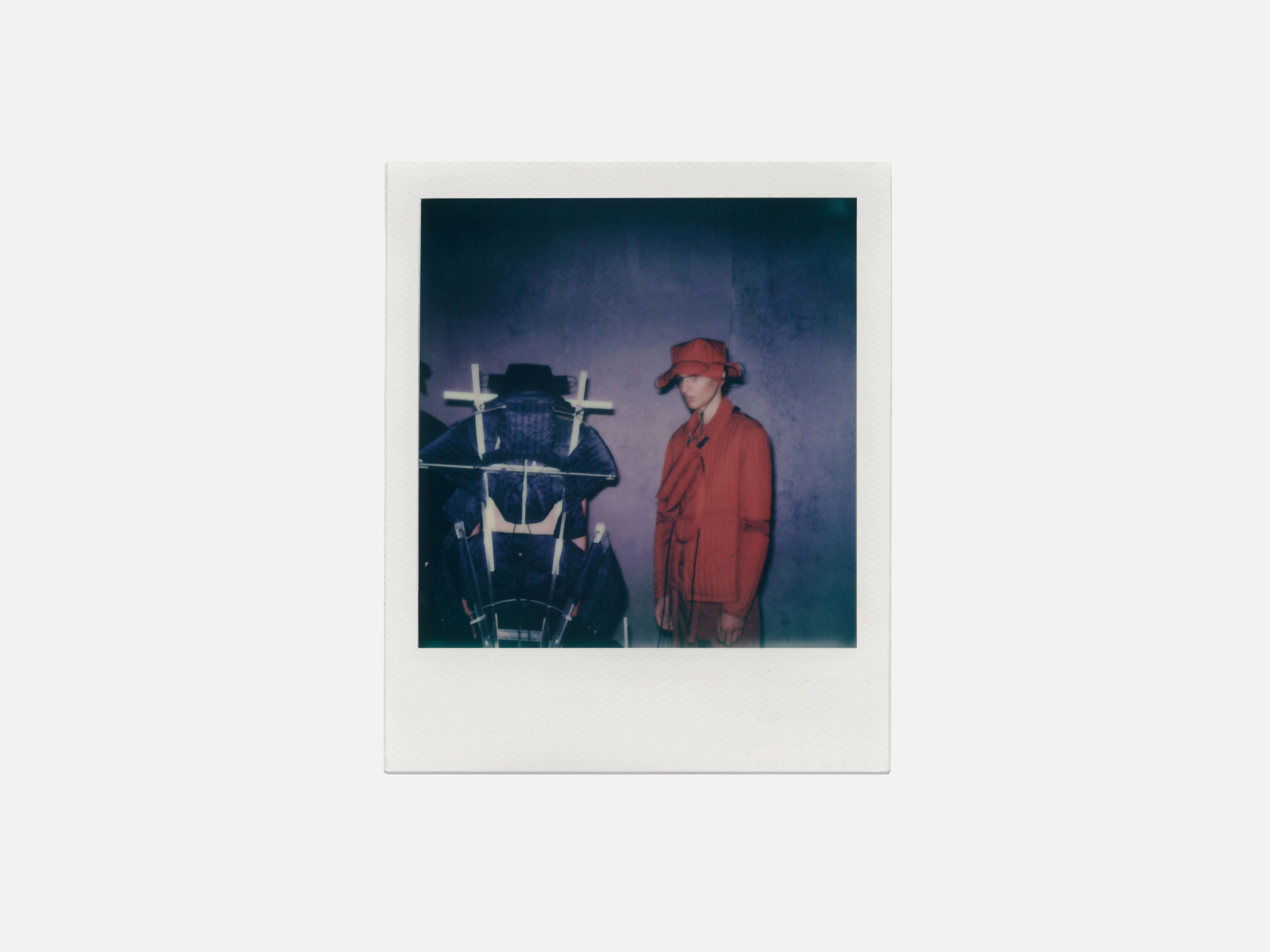 ⏤ Since 2017, his highly experimental designs for Moncler (in the context of the Genius project of the down jacket brand) - incredible pillowy sculptures conceived as habitats in and of themselves - have caused a sensation, consolidating his reputation as an artist-designer. On the occasion of his Spring/Summer 2021 collection, a series of Polaroids was shot backstage, a selection of which has been entrusted exclusively to Exhibition Magazine. Designed during the 2020 lockdown, the architectural pieces question the boundary between (science-)fiction and reality, ideas of intimacy and comfort in the age of working from home (for the first time the models are wearing ties!) and underline, like a leitmotif, the importance of the collective. There is innocence here, too. The models are crowned with metallic hats which call to mind mobiles for babies. Because, for Craig Green, clothes are there first and foremost to protect us.