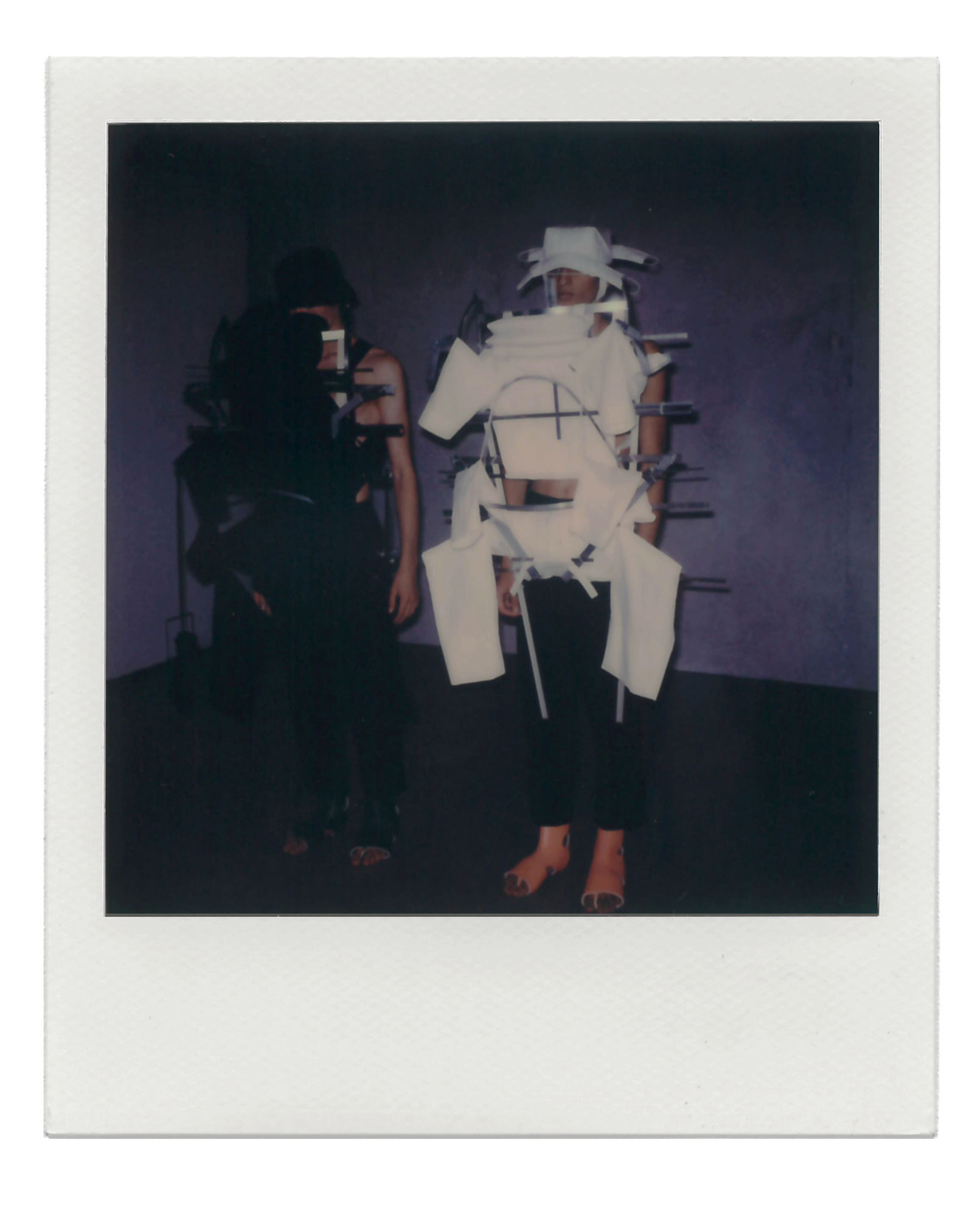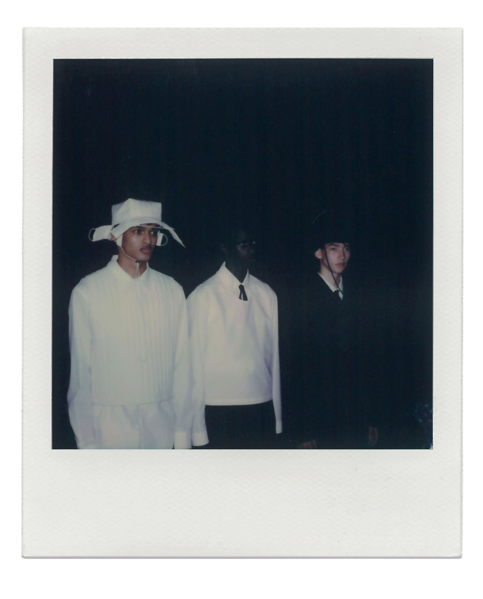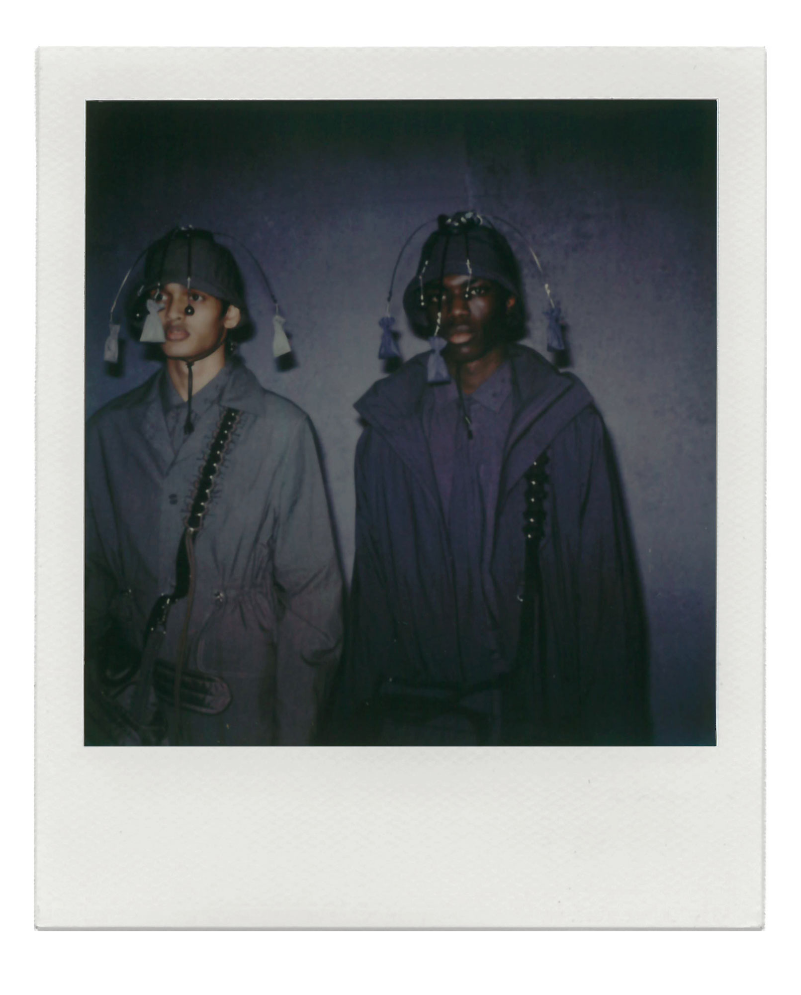 ⏤ Since 2017, his highly experimental designs for Moncler (in the context of the Genius project of the down jacket brand) - incredible pillowy sculptures conceived as habitats in and of themselves - have caused a sensation, consolidating his reputation as an artist-designer. On the occasion of his Spring/Summer 2021 collection, a series of Polaroids was shot backstage, a selection of which has been entrusted exclusively to Exhibition Magazine. Designed during the 2020 lockdown, the architectural pieces question the boundary between (science-)fiction and reality, ideas of intimacy and comfort in the age of working from home (for the first time the models are wearing ties!) and underline, like a leitmotif, the importance of the collective. There is innocence here, too. The models are crowned with metallic hats which call to mind mobiles for babies. Because, for Craig Green, clothes are there first and foremost to protect us.