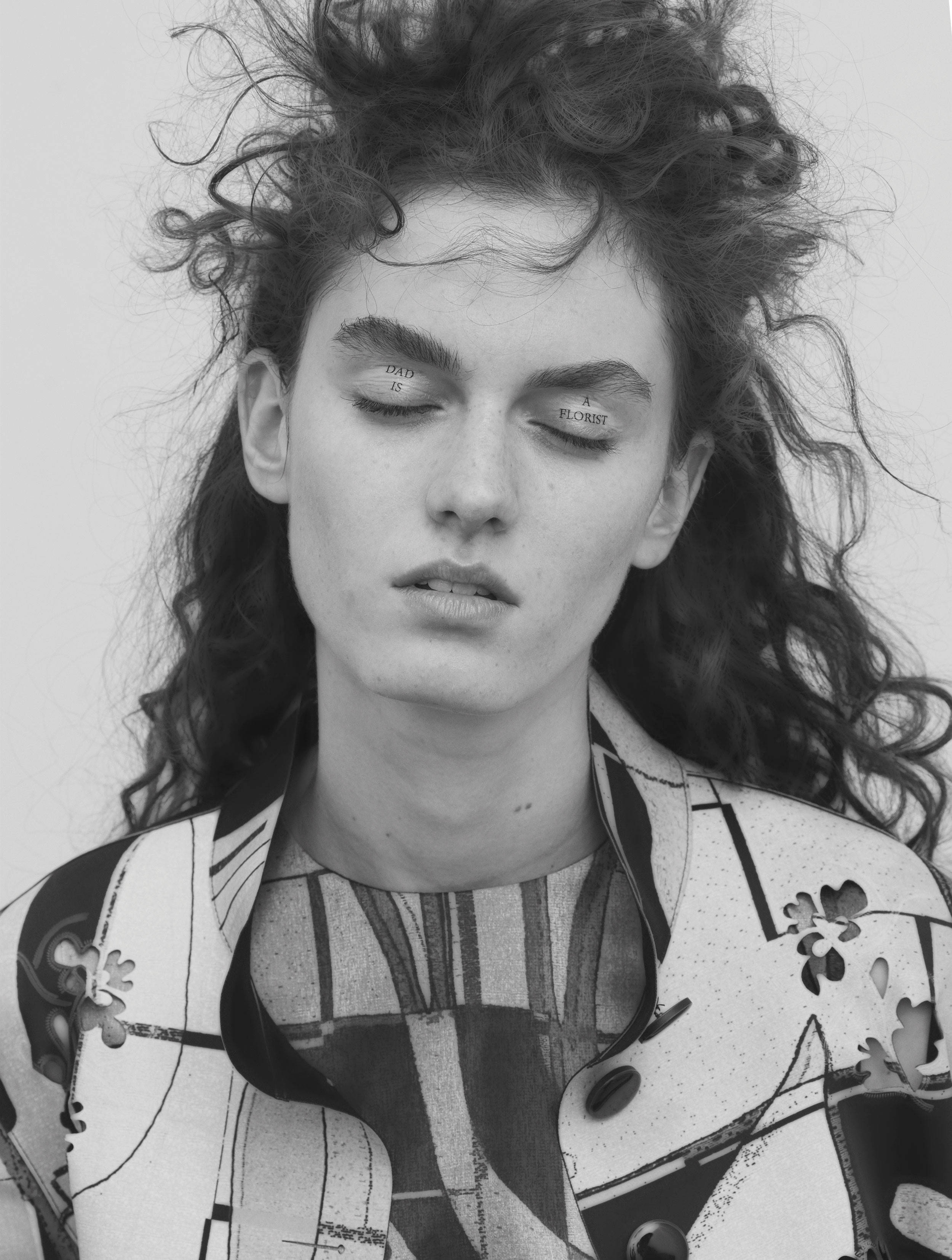 Laser printed techno cady jacket printed silk top and pants.