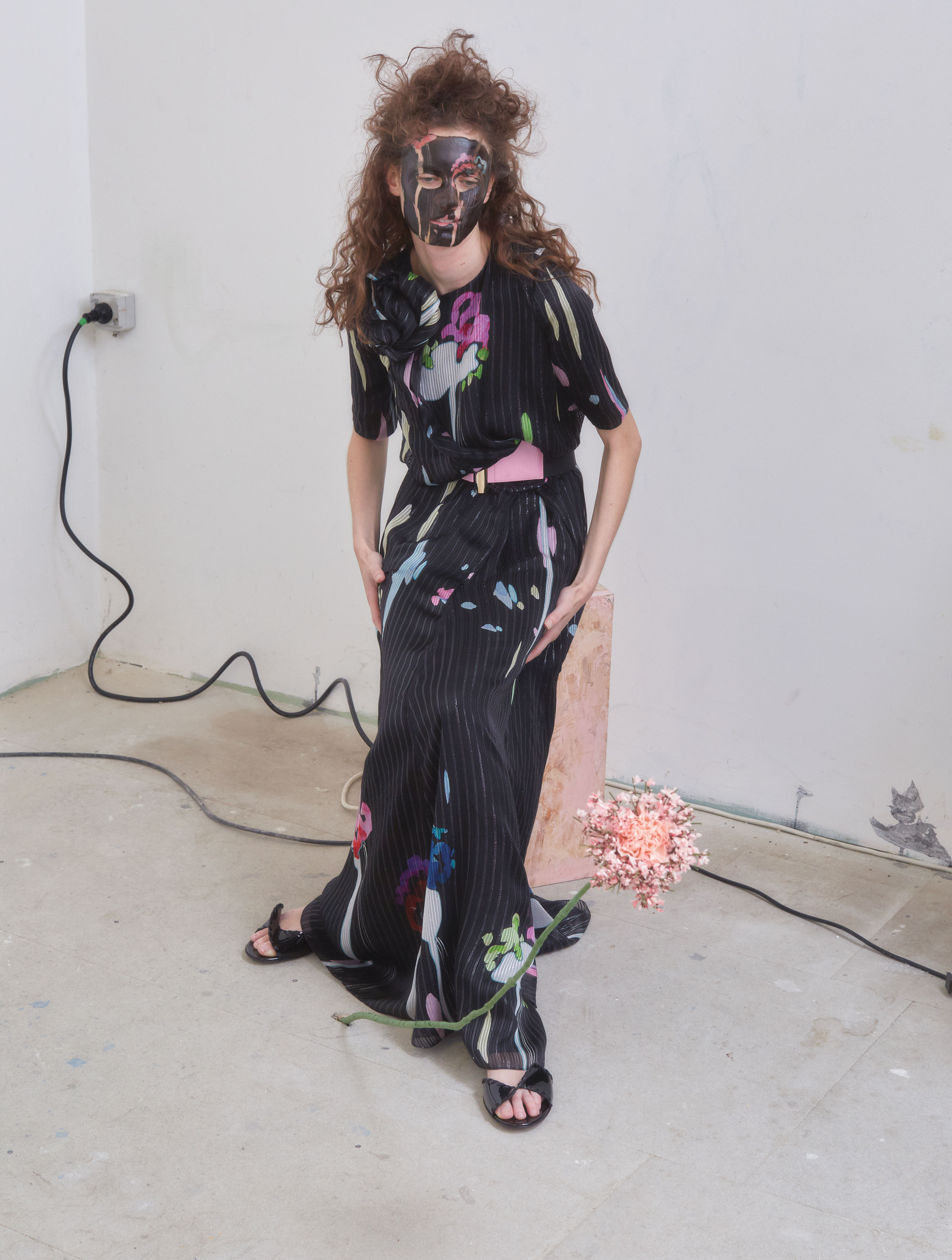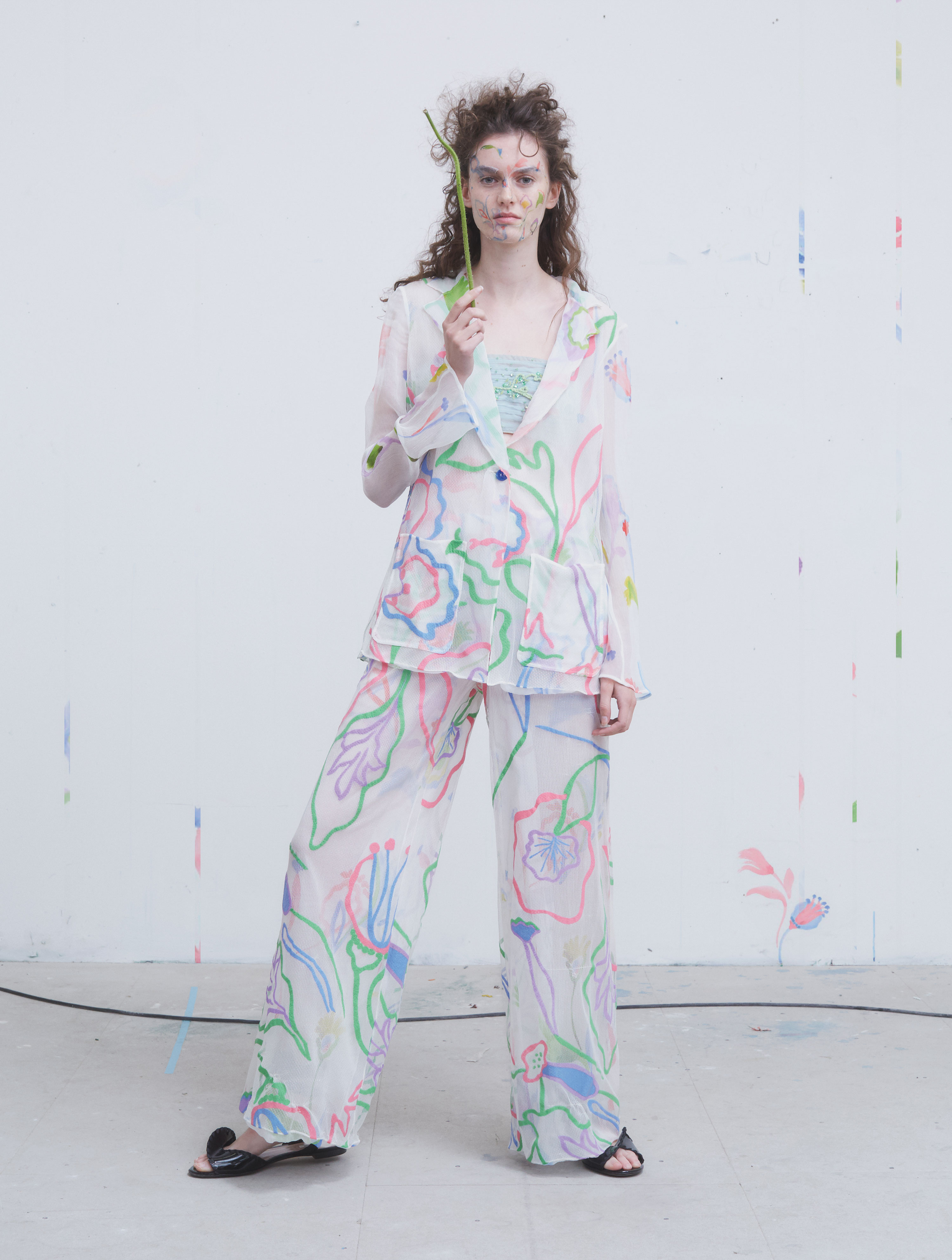 Silk mesh seed stitch suit, floral print. Patent leather sandals.
