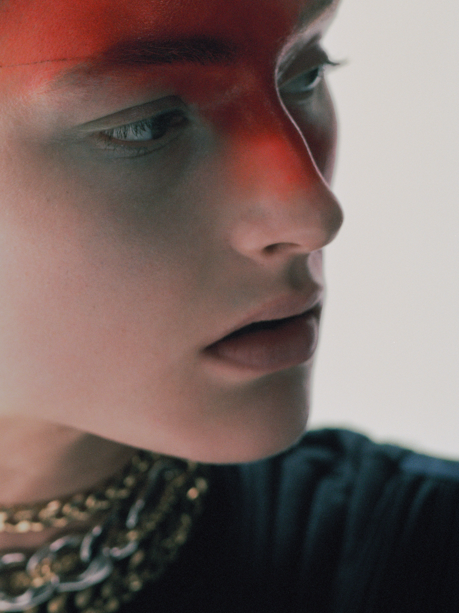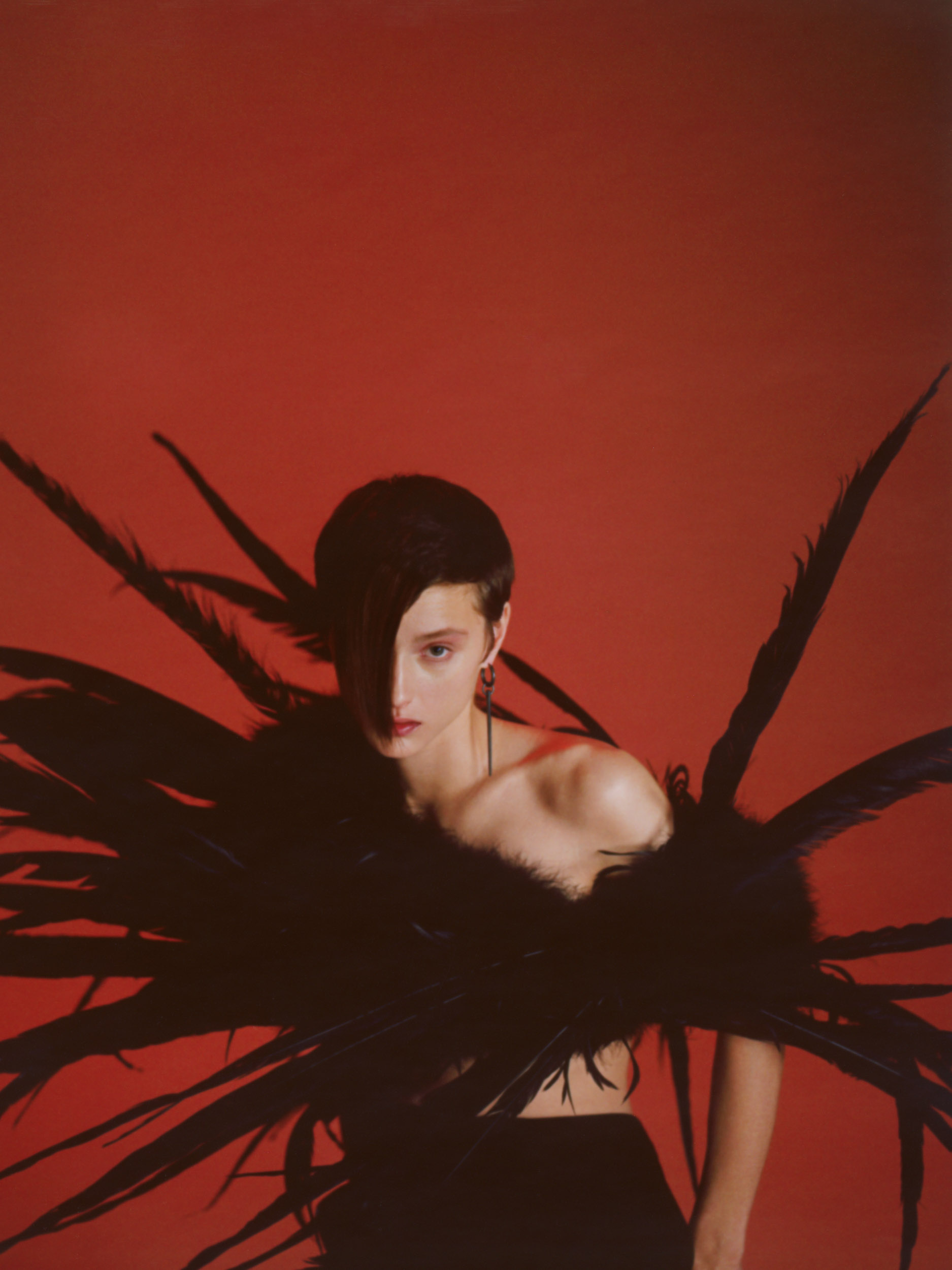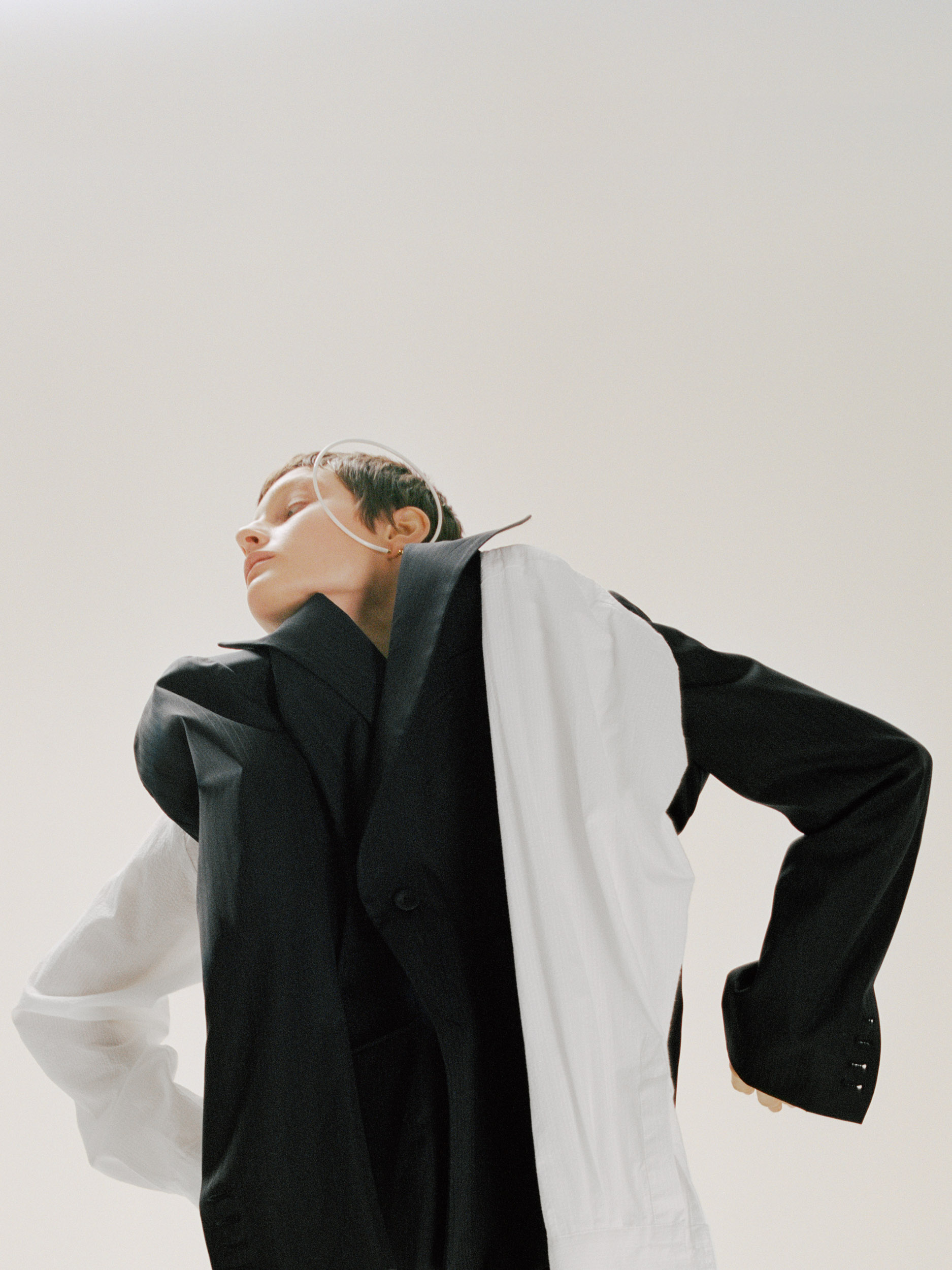 Ruffled jersey body, crossed satin dress, tailored pants and veil MM6 by MAISON MARGIELA