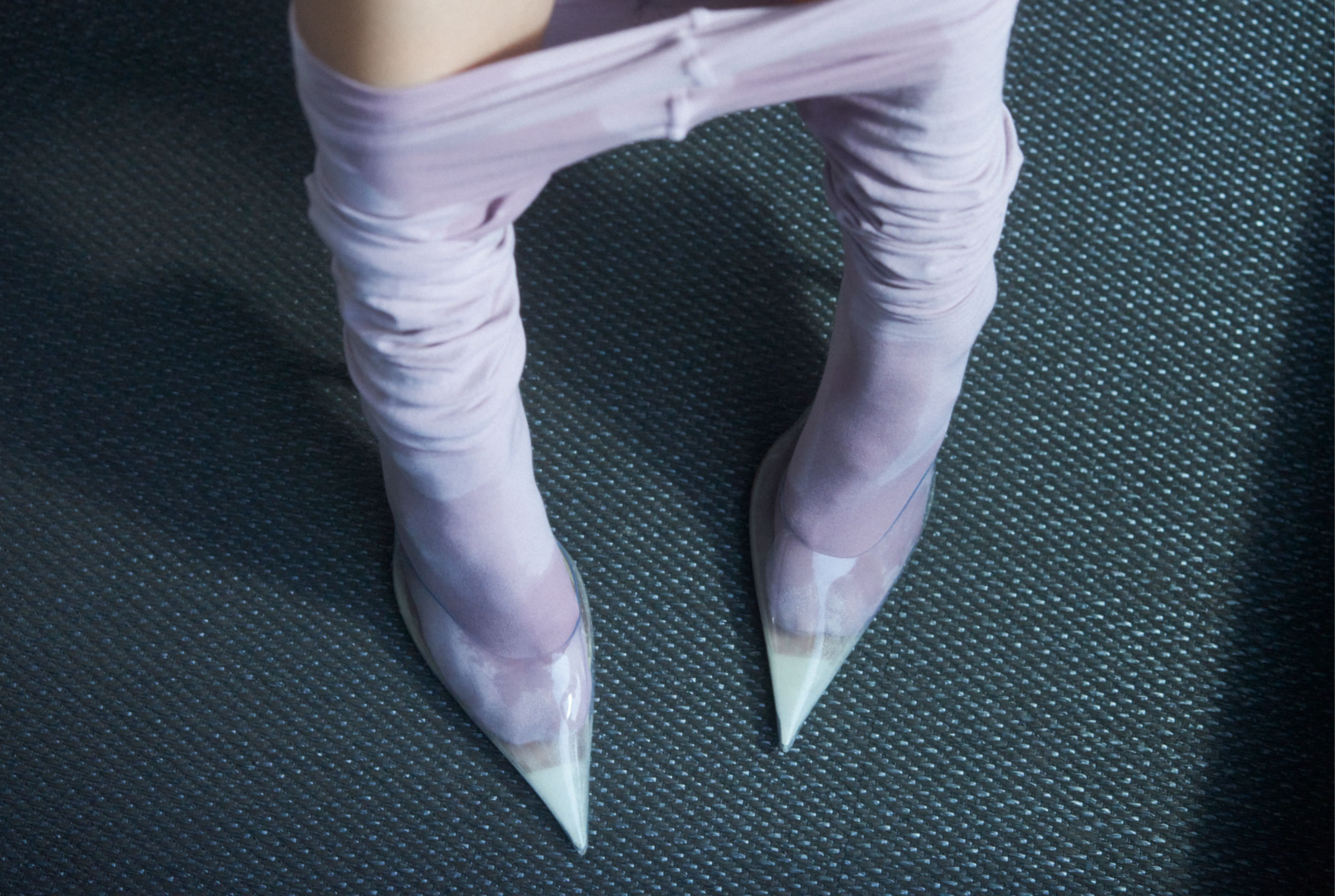 Nes is wearing jumper LOEWE, skirt MAISON CLOSE, shoes MANOLO BLAHNIK