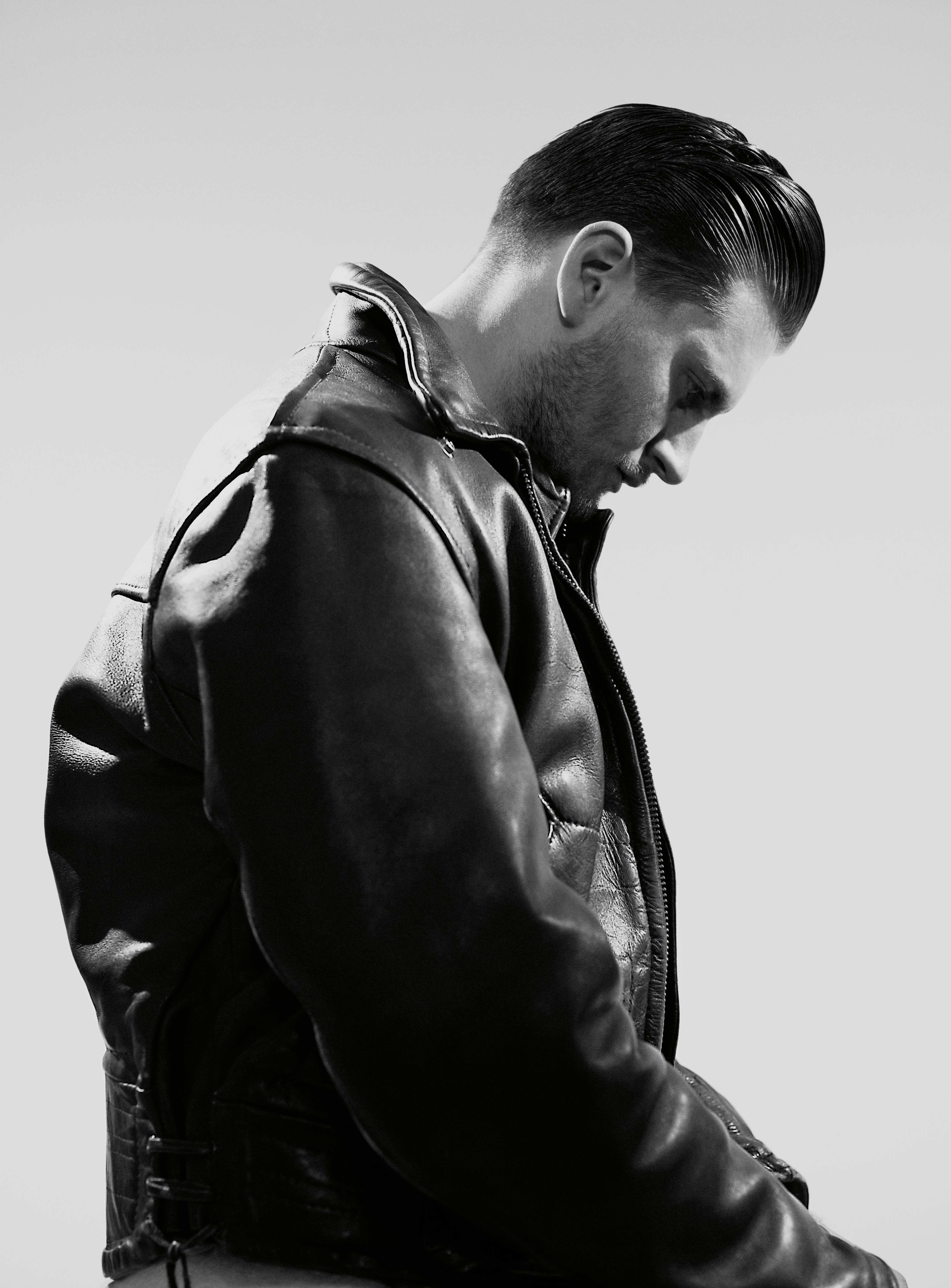 Patrick McGrath wears a leather vintage Perfecto jacket from New York Vintage