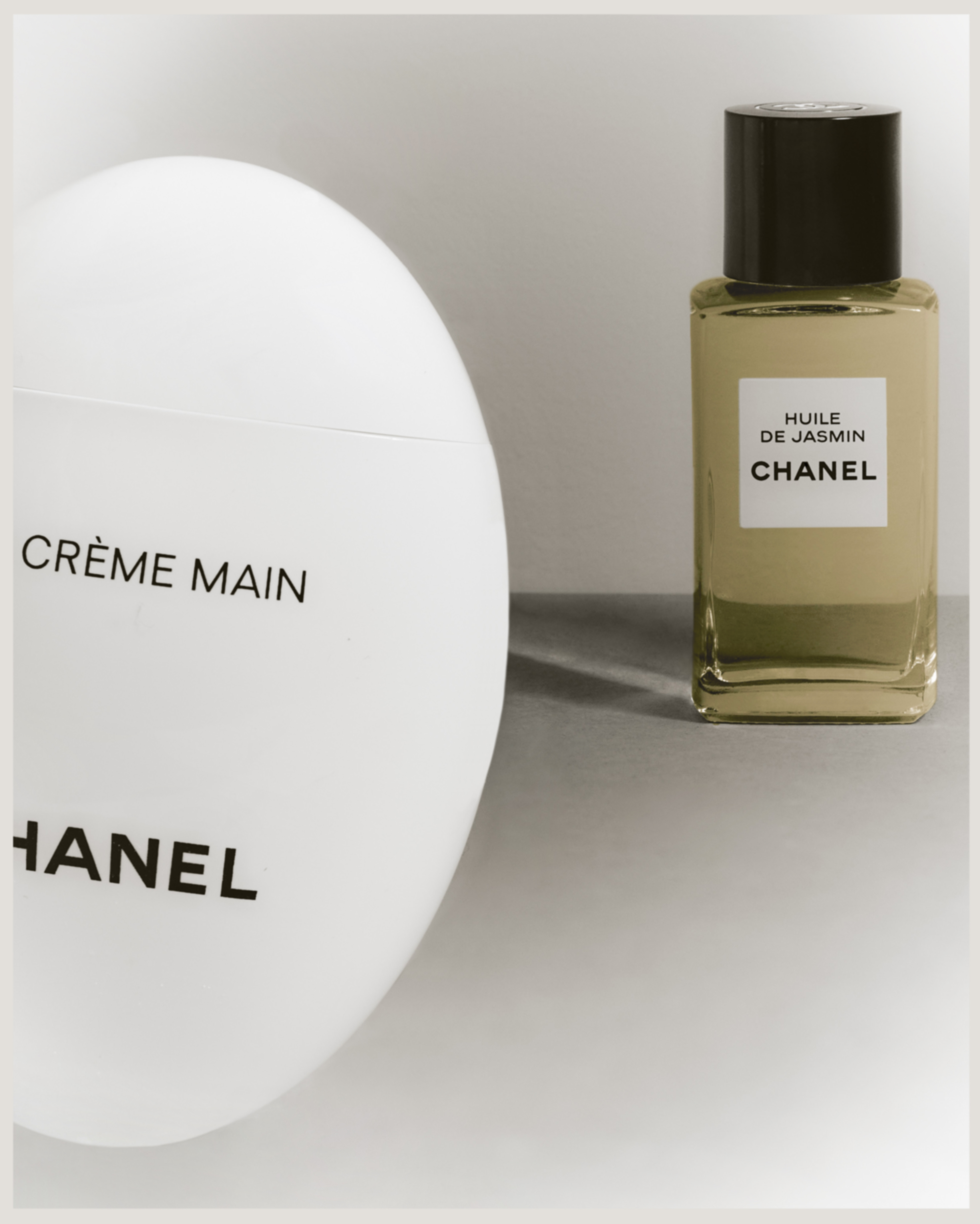 In this selection two of CHANEL most iconic beauty products: La Crème Main and Huile de Jasmin. Two signature products elaborated with hand-picked flowers cultivated in the house's very own fields located in Grasse, South of France. Two products enclosing countless caring and regenerative properties contributing to women’s beauty. Two beauty items marking the beginning and the end of every beauty and care routine. These are milestones of CHANEL Beauty offer range, yet their packaging remains sober, simple, small.