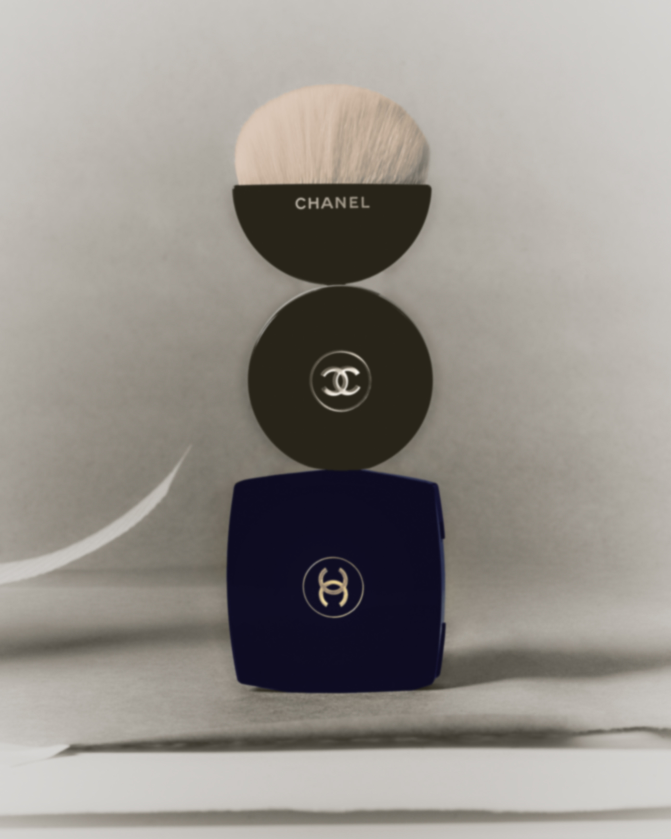 2. The invitation is sustained and propelled by the white ribbon pointing at Chanel Beauty's items. The products are here presented through a sculptural layering made from a single product’s components. By doing so, Hanna elevates the items to the state of art, just for the pleasure of the eyes.