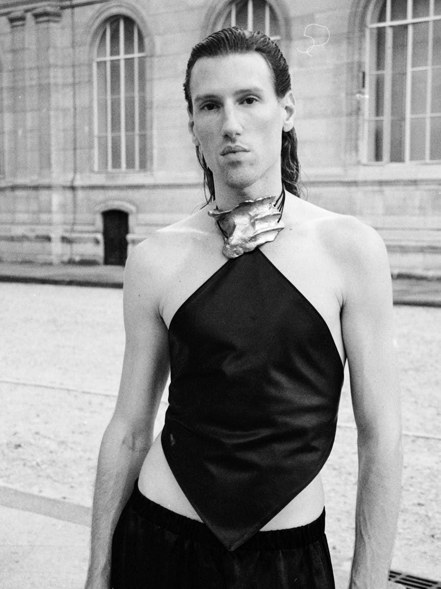 He flicks through one of the copies of Exhibition which Edwin and Sophie have brought him. After a beer before the meal, he asks for white wine to accompany his fish. « Oh, you work with Marine Serre? She designs the stage outfits for me and my group. » The designer has crafted some very becoming lace leggings for him.