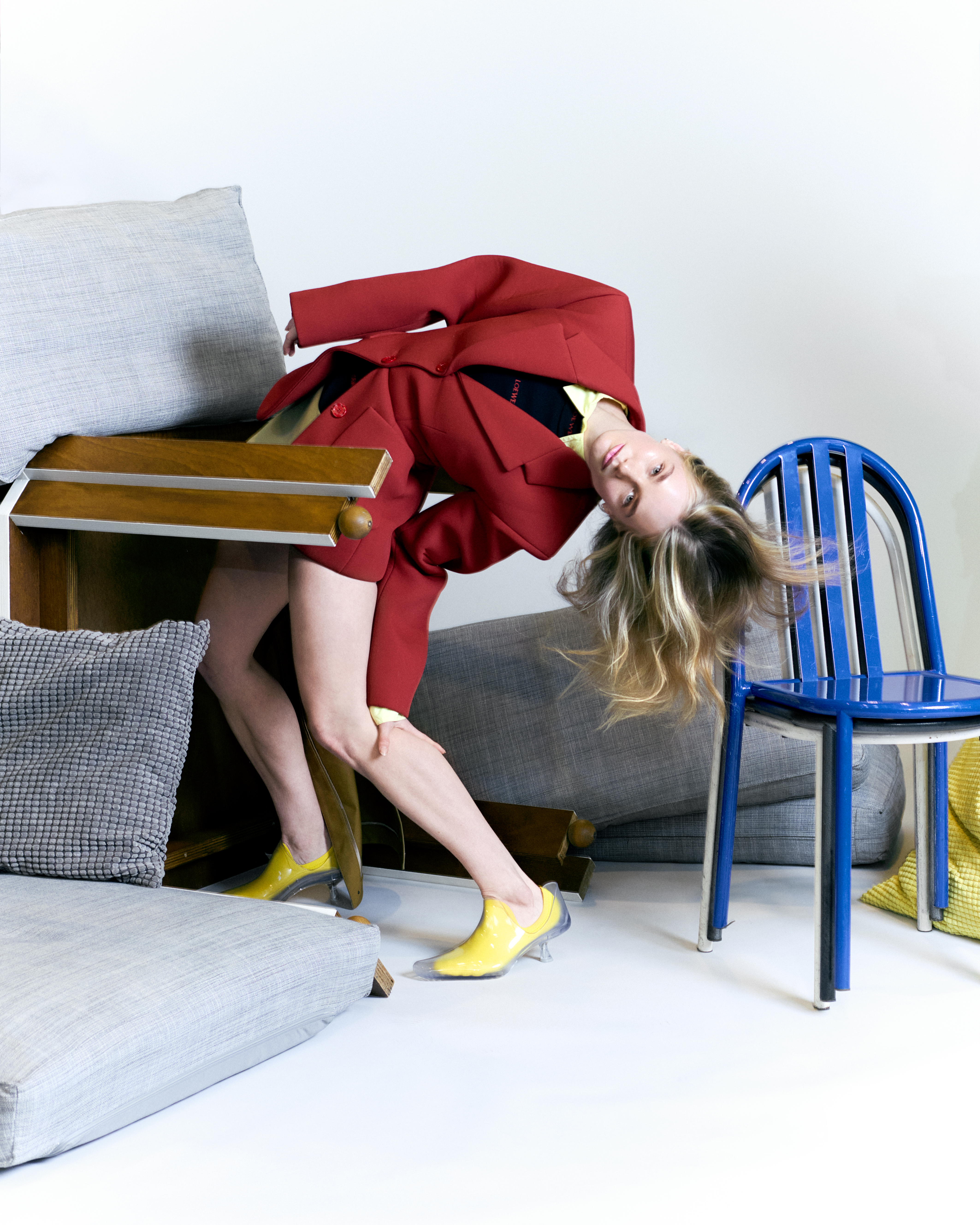 Marine wears OUDE WAAG jacket, GUCCI shoes and earrings, JEAN PAUL GAULTIER trousers.