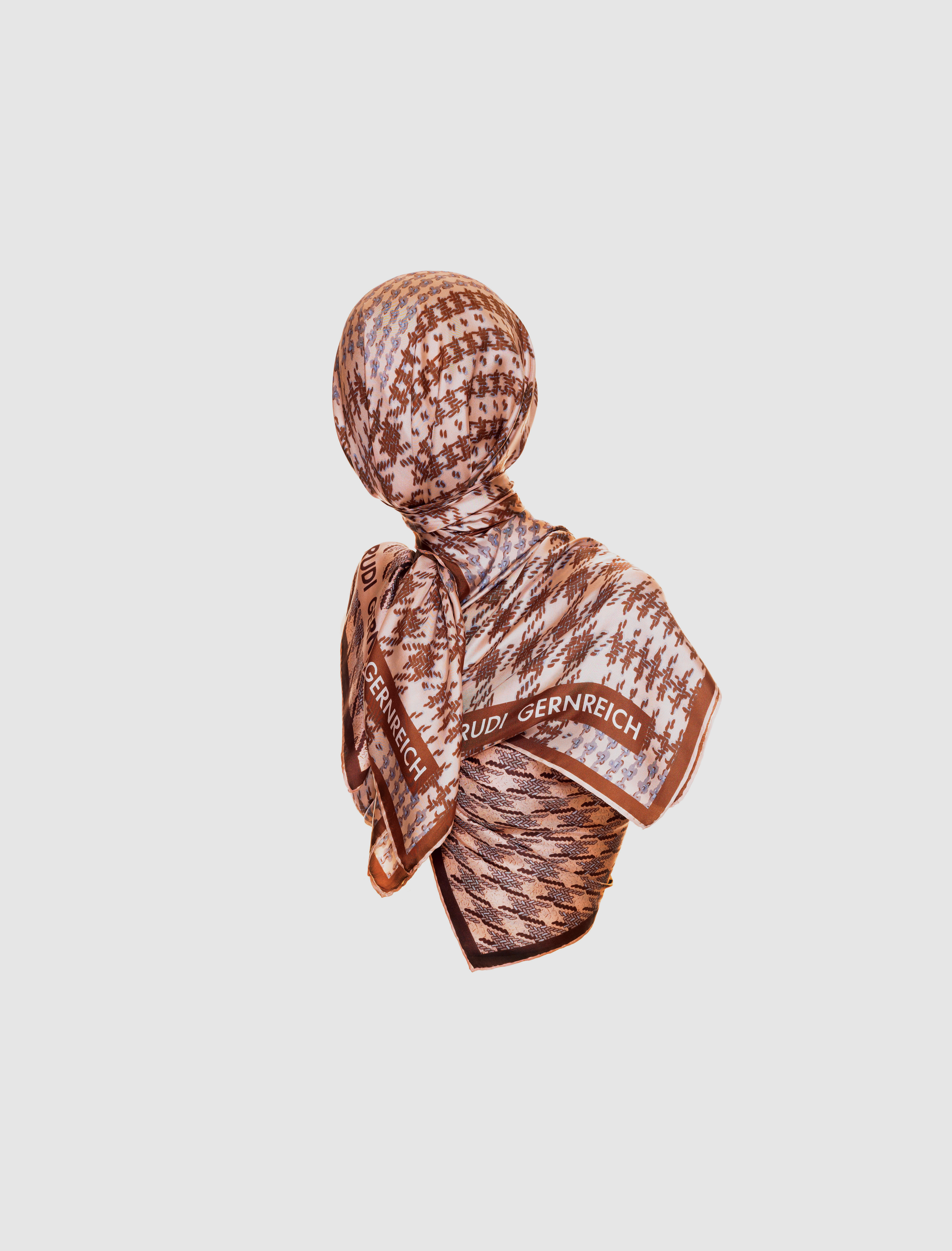 But naturally the collection in question contains no ordinary scarves. These are the creations of 20th century fashion pioneer Rudi Gernreich. Famous for his «monokini» and futuristic aesthetic, the scarves were a central component of his collections. He wanted to create a «total look» for buyers, such that they could dress from head to toe in his designs, completely ensconced in his vision. Indeed each scarf conveys the conceptual meat of a given period, whether through the insignia of his notorious military collection or with the brilliantly colored polka dots of his more iconic clown-inspired work. Nevertheless, the scarves have long been neglected in the history and photography of Gernreich’s work. The Rudi Gernreich story tends to focus on his prior career as a dancer and his consequent genius for framing the body through radically new cuts and shapes. But Gernreich also had a prior career as a fabric designer, and its influence emerges exquisitely in the arresting, strongly graphic and brilliantly colored squares of silk. These were not a last minute add-on accessory but individual works of art, finished off with boldface print of Gernreich’s name in the corner of each one.